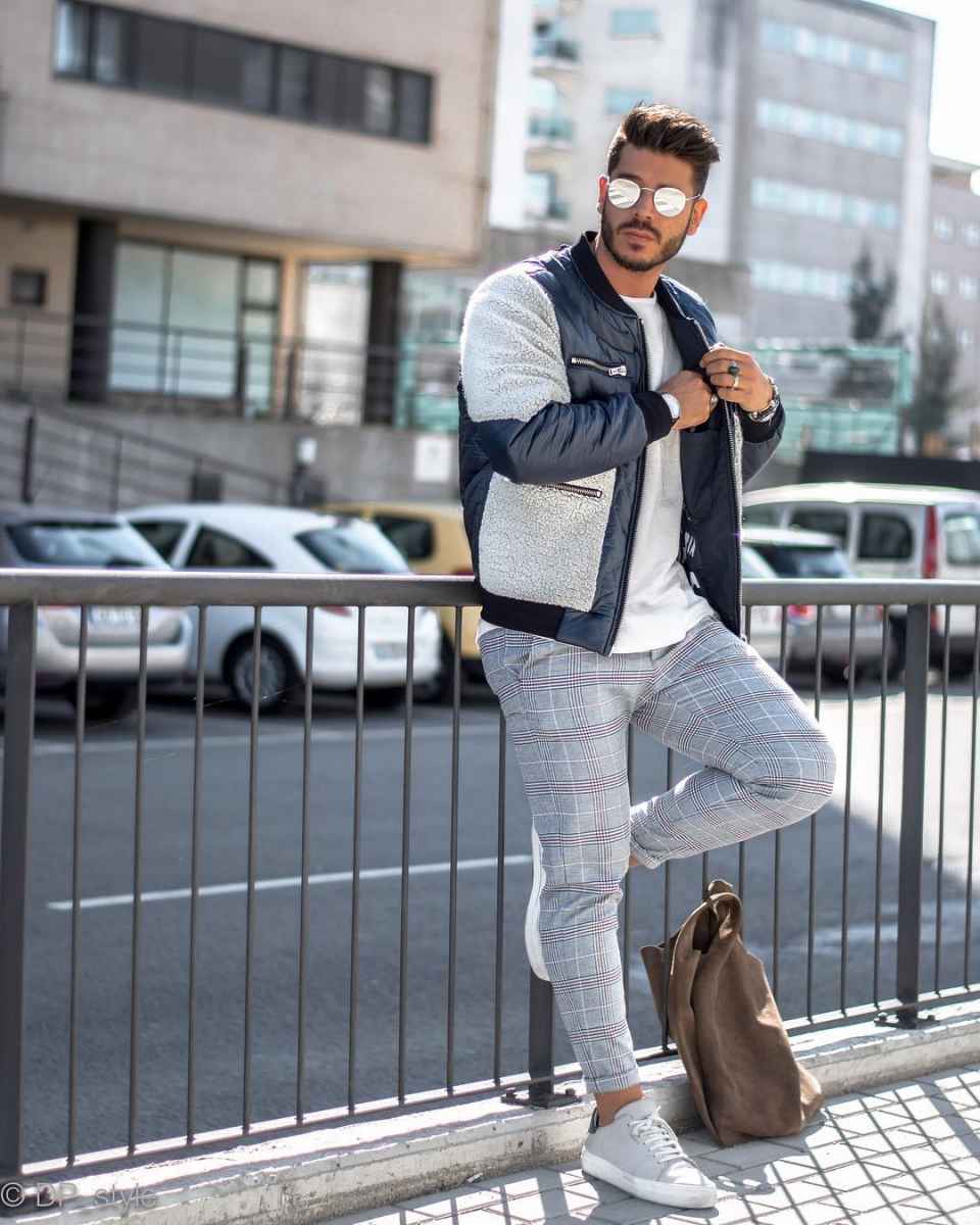 - Любителям спортивного стиля понравится сочетание чёрной «кожанки» с коричневыми брюками, рубашкой в клеточку и высокими кроссовками. Дополнит образ сумка-шоппер.