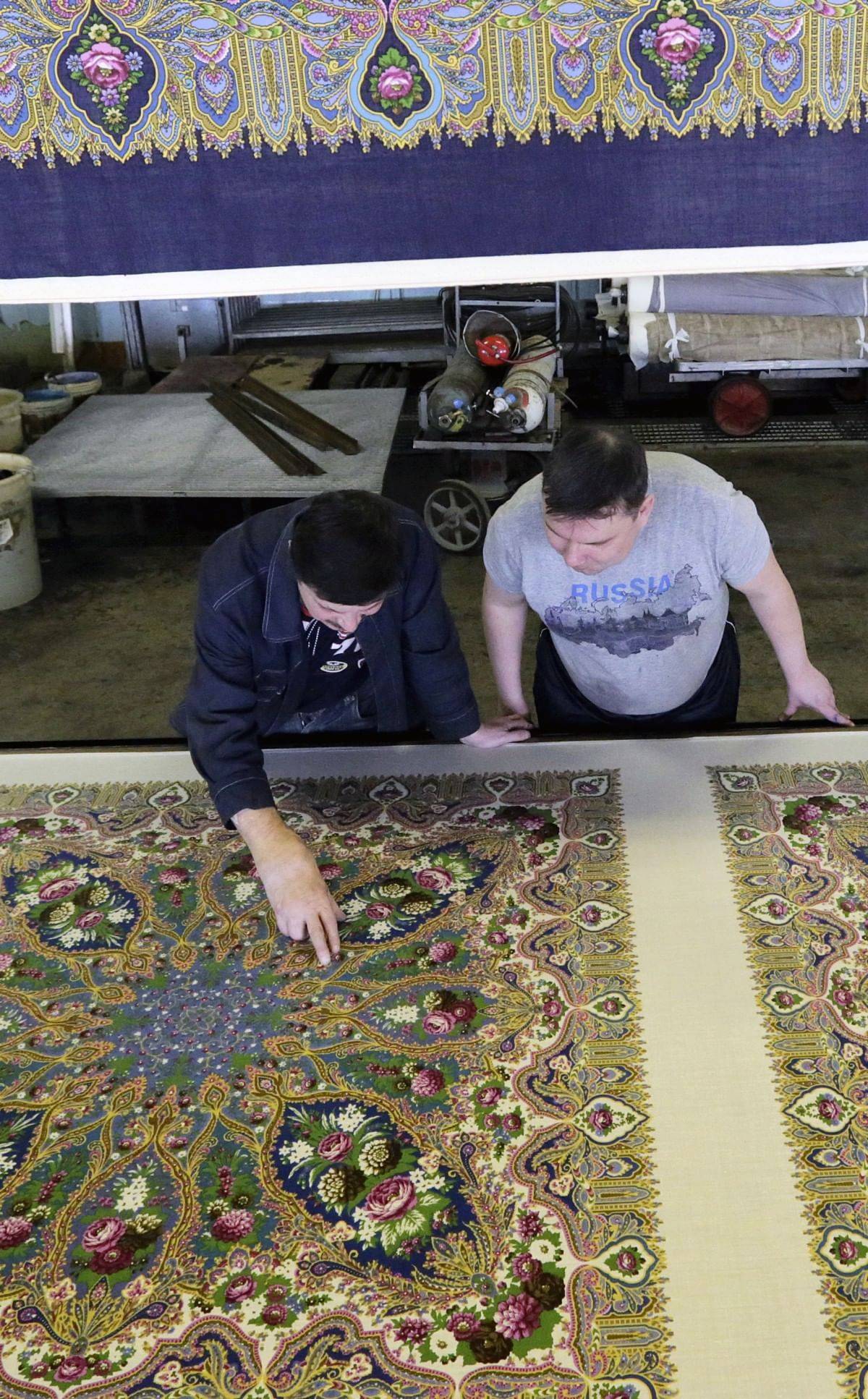 Нанесение платочного рисунка на ткань методом печати по шаблону в цеху ОАО «Павловопосадская платочная мануфактура». Фотография: А. Геодакян / ТАСС