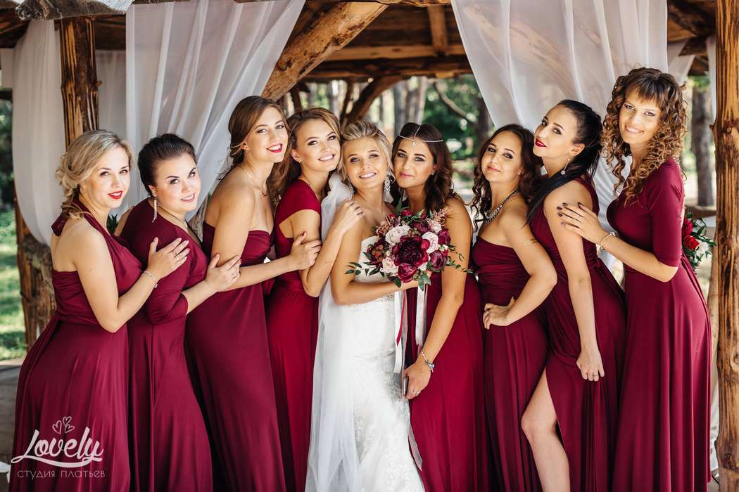 На фотографиях красиво выглядят подружки невесты, одетые идентично. Но не всем девушкам подойдут однотипные фасоны одежды, стоит посоветоваться между собой для достижения единого мнения. Иногда разделяют подружек на старших и младших, подбирая для каждой категории подходящий цвет и длину платьев.