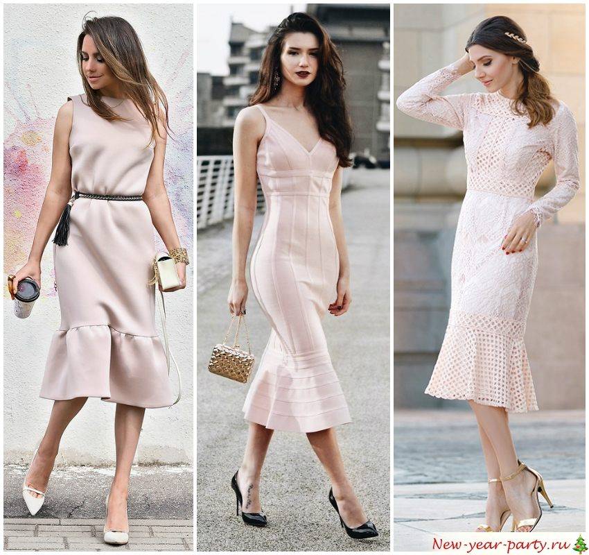 - платья «рыбка» – шикарный фасон приталенный сверху и расклешенный к низу. Для динамичного корпоратива такой фасон не подойдет, а вот для спокойных посиделок в ресторане он будет уместнее всего.