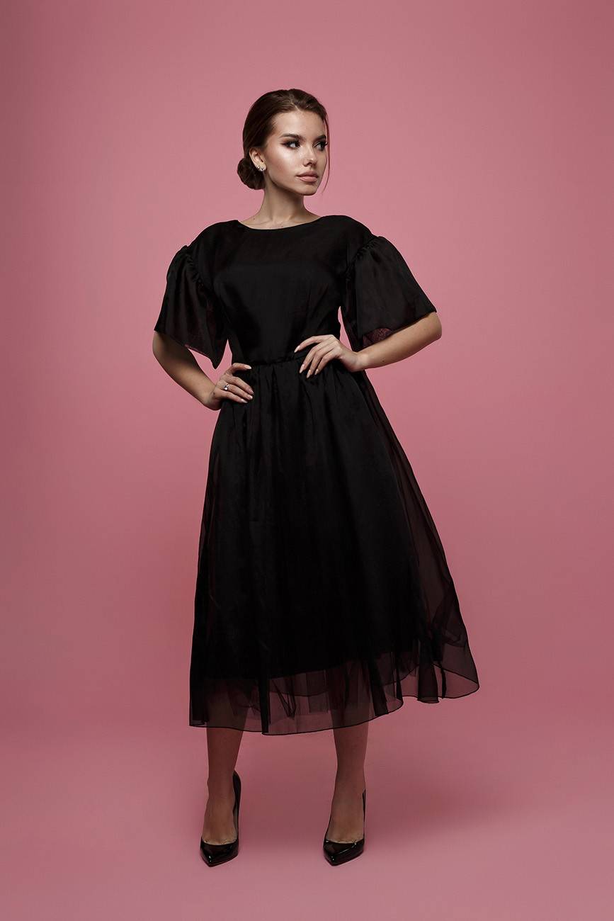 - Выигрышный вариант — модель формы «баллон». Юбка присборенная, длина миди, расширенные плечи.