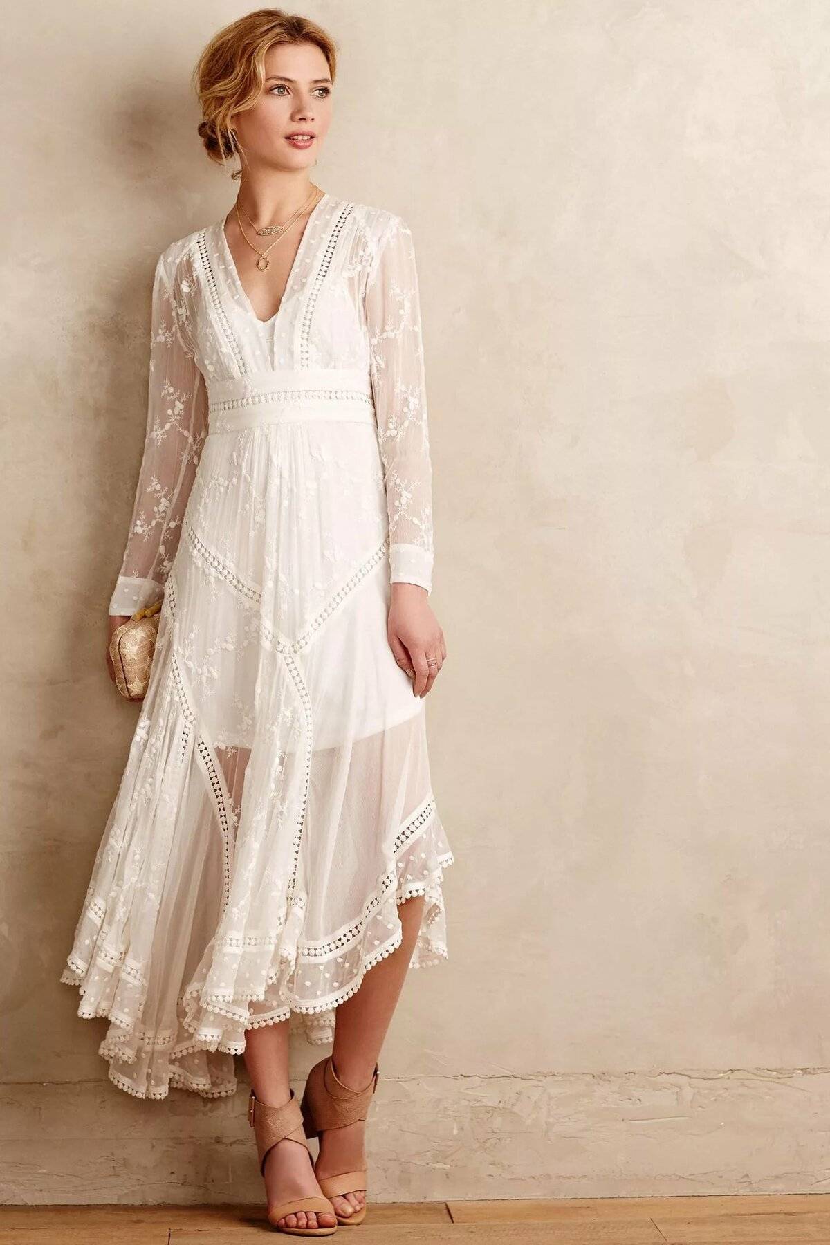 Платье-туника. Этот вид относится к повседневному стилю. Благодаря свободному покрою, такой наряд скрывает все недостатки фигуры и абсолютно не стесняет движения. Туники по своей сути так же разнообразны: длинные ниже колена, короткие, с длинным шлейфом сзади, кружевные, сетчатые и т.д. В цвете тоже не стоит ограничиваться: от белоснежного до фиолетового платья.