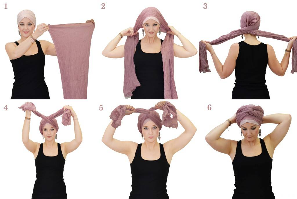 Сложить палантин вдоль, обернуть им голову, концами к затылку. Обмотать голову вокруг лба, образовывая «чалму». Концы шарфа завязывают на лбу или уводят назад, фиксируя на затылке.