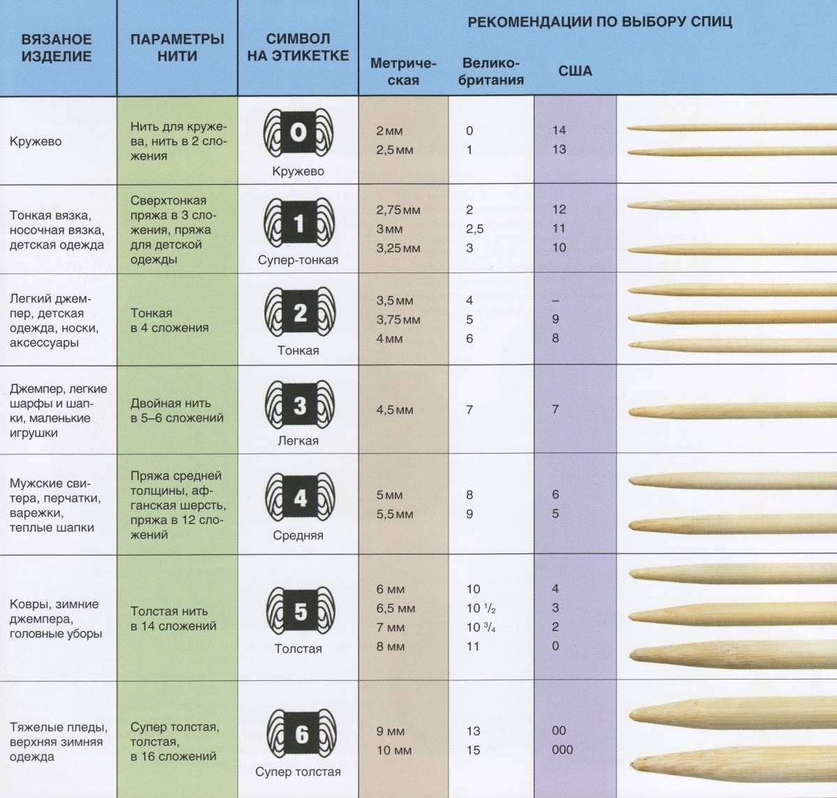 С размерами спиц вы можете ознакомиться в таблице ниже. В мастер классах всегда указывают, какой размер спиц необходим.