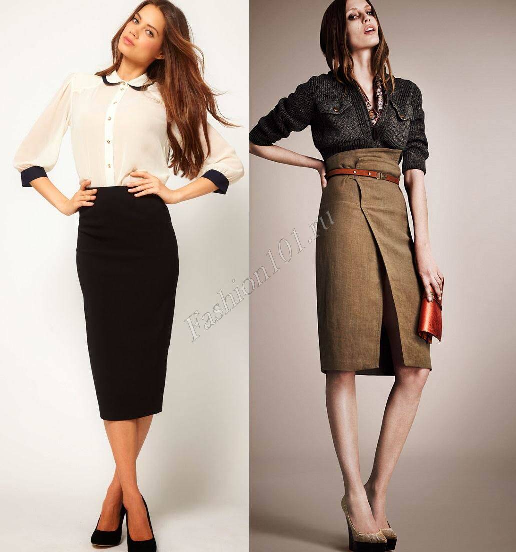 Офисный дресс код предусматривает сдержанность, а поэтому советуем держатся нейтральных тонов. Хотя никто вас не осудит, если предпочтете надеть кожаную юбку карандаш в контрастном цвете. Очень хорошо будет смотреться черная (серая, темно-синяя) юбка карандаш в паре с белой блузкой, светлой рубашкой и строгого стиля обувью. В прохладное время всегда можно добавить модный жакет или трикотажный короткий кардиган (либо до середины бедра) немного свободного кроя. Смотрите фото подборку лучших сочетаний.