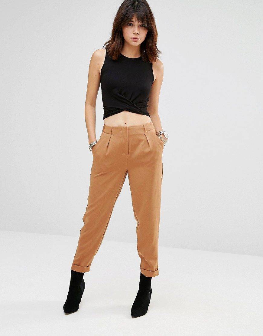Сочетайте брюки с водолазкой, боди или облегающей кофтой, топом на бретелях, с футболкой, рубашкой, завязанной узлом на талии. Накиньте на плечи джинсовую куртку или пиджак – и образ готов!