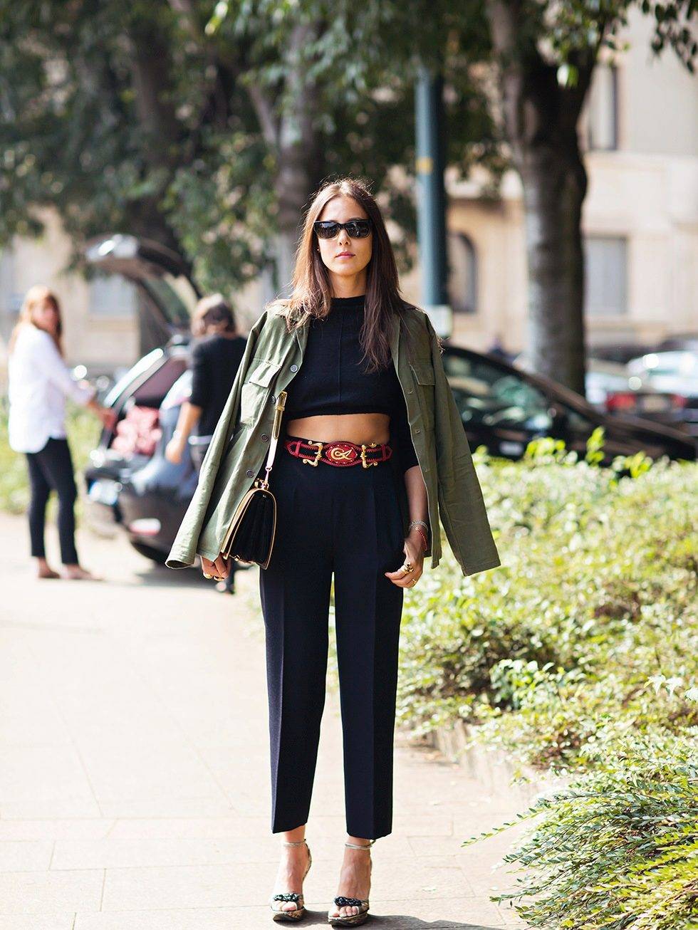 6. Наденьте короткий топ. Укороченные брюки с высокой талией великолепно смотрятся с топами, заканчивающимися на талии. Таким образом можно визуально удлинить ноги.