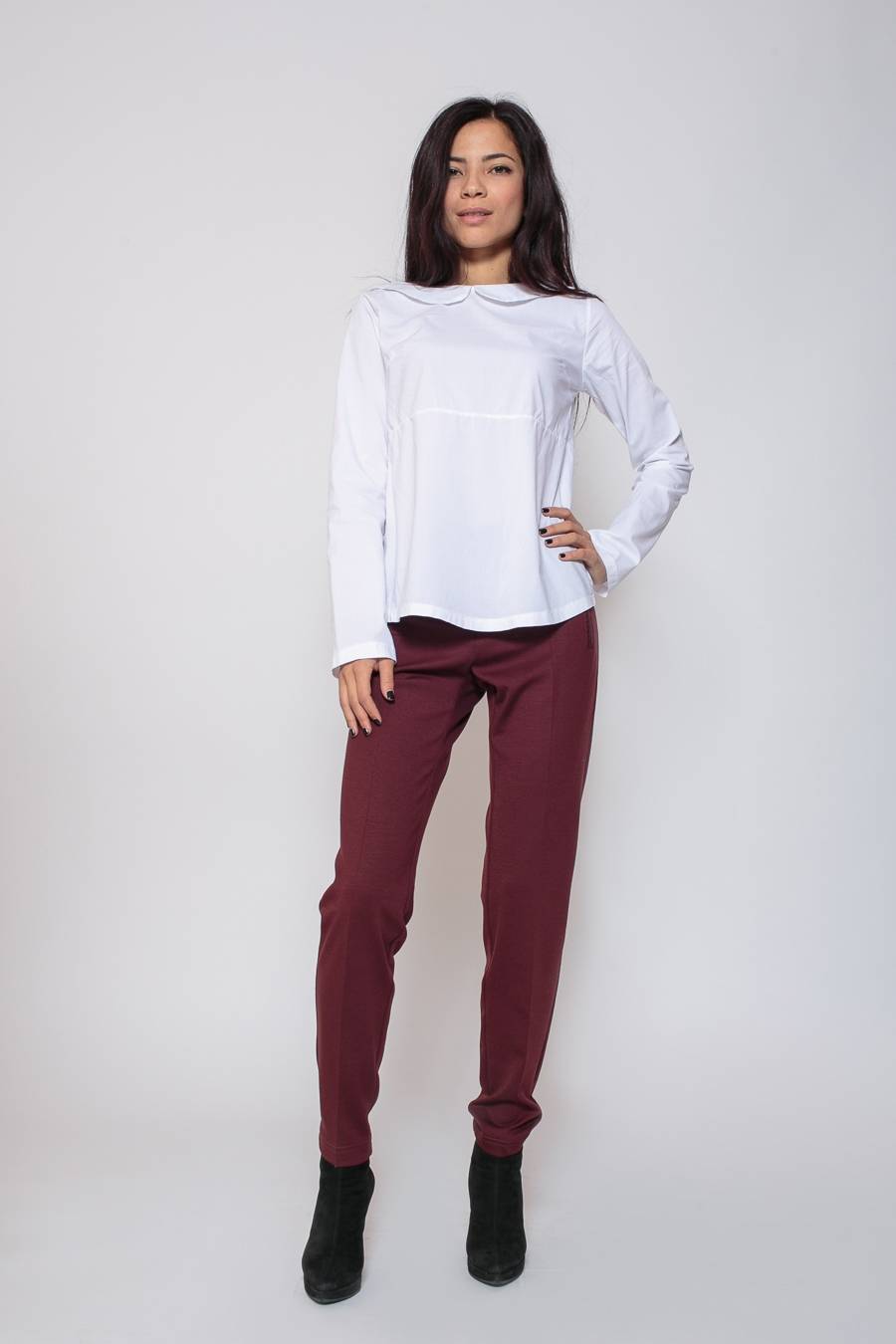 Для любительниц поярче цветные модели, но тогда более сдержанный верх. Красные или бордовые брюки в сочетании с черным, белым или темно-синим.