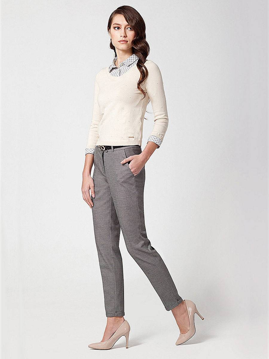 Штаны плавно сужаются книзу, облегают бедра, акцентируют внимание на тонкой лодыжке. На деловую встречу или официальное мероприятие традиционные брюки надевают со строгой рубашкой, пиджаком или жакетом