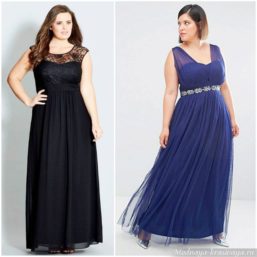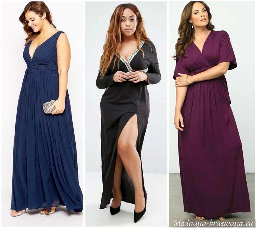 Длинные для полных модели считаются одним из лучших решений. С их помощью удается скрыть определенные несовершенства фигуры и сместить при этом акцент на другие, более привлекательные зоны. Отлично подойдут варианты в пол для полных с глубокой зоной декольте. Достаточно подобрать утягивающее нижнее белье, чтобы вечерние наряды стали настоящим украшением.