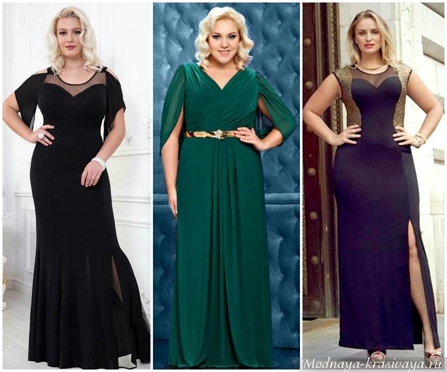 Вечерние наряды в максимальной длины позволяют женщинам выглядеть выше и стройнее. На фото представлено несколько нарядных вечерних платьев, идеально подходящих для полной фигуры.