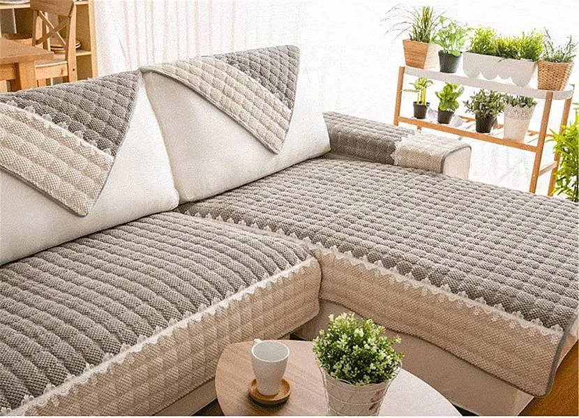 Угловые чехлы, выкроенные мастером по мерке, фиксируются на мебели надежно, и аккуратно. Однако не для каждого дивана можно отыскать соответствующий ему дивандек или еврочехол. Выйти из положения помогут несколько обычных пледов или покрывал.
