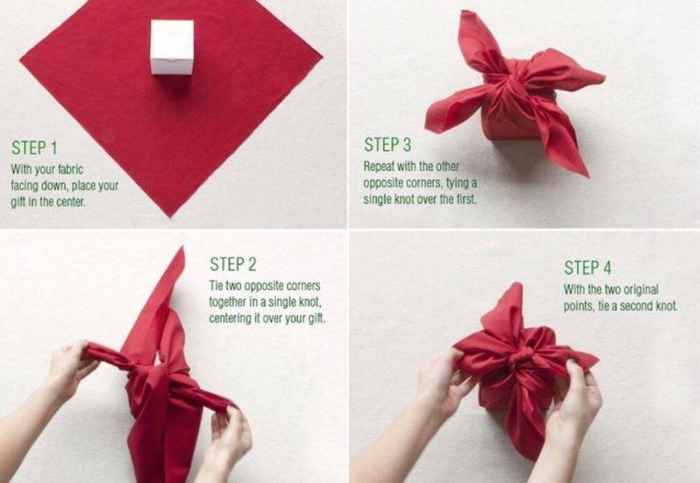 Ткань. Сейчас большой популярностью пользуется японская техника упаковки подарков, которая называется «фуросики». Пришли к нам из древности. Упаковать такой подарок очень просто. В середину платка или квадрата ткани складываем плед. Края завязываем между собой крест-накрест в крепкие узлы. Ведь это еще и мешочек, в котором можно презент принести. Поверх упаковки, в узел, можно засунуть какую-нибудь оригинальную вещицу, символически связанную с темой.