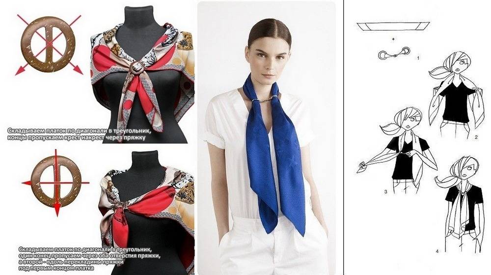 Нарядно и стильно выглядит платок, завязанный с помощью красивого аксессуара. Для этой цели можно использовать брошь с фиксатором-клипсой, пирамидой из трех колец или с зажимом в виде цилиндра или кольца.