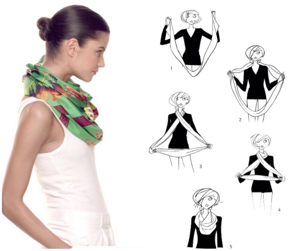 Если вам нравиться знак бесконечности, можете воссоздать его с помощью своего платка! Создайте форму «лапши», свяжите концы в узел, создав замкнутый круг. Оберните шарф вокруг шеи (узлом сзади), закрутите один раз спереди, чтобы образовалось еще одно меньшее отверстие, и просуньте голову в отверстие, сделав двухслойный знак «бесконечность».