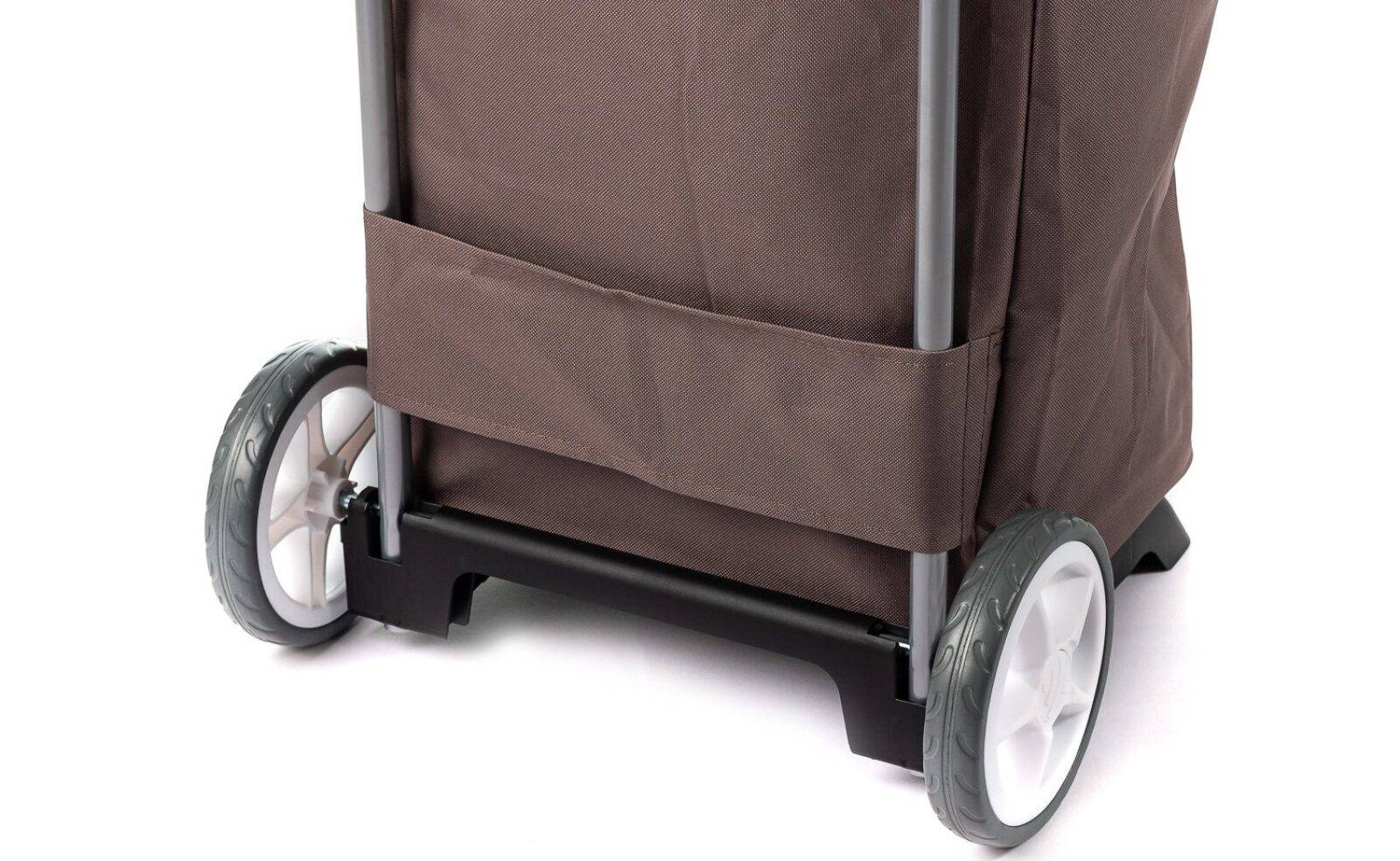 Все используемые материалы отличаются высоким качеством. Каркас выполнен из стали с полимерным покрытием, а текстильная часть из водонепроницаемого полиэстера. Прорезиненные колеса диаметром 16 см обеспечивают плавный и бесшумный ход. Подножка складывается одним движением, а вот ручка не телескопическая, имеет постоянную длину.