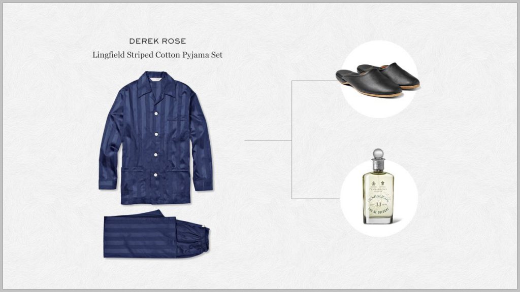 Если ты такой человек, который нуждается в изысканной одежде, независимо от того, какая часть твоего тела покрыта одеялом, ты не должен смотреть дальше, когда речь заходит о ночном белье, чем Derek Rose. Семейный концерн, основанный в 1926 году, этот британский бренд славится выпуском высококачественных пижам для самых требовательных клиентов. Эта атласная полосатая пара из тонкого дышащего хлопка дает роскошное ощущение твоей коже. Она является ярким примером опыта компании, с декадентской эстетикой начала 20-го века, столь же вечной, как шелковый галстук Drake. Добавь немного классики с парой кожаных тапочек этого бренда и с помощью одеколона No.33 Cologne от Penhaligon’s – другой британской организации.