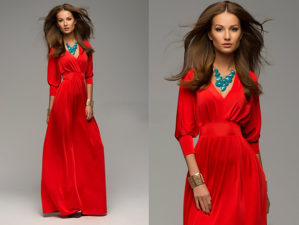 Длинное платье красного цвета не требует большого количества украшений. Достаточно одеть тонкую золотую цепочку, брошь или кольцо. К нему следует надевать чёрные или тёмно-красные туфли на высоком каблуке.