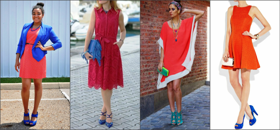 Сочетание, которое никогда не будет проигрышным, неинтересным или незаметным. Поэтому смело надевайте алый наряд, насыщенные синие босоножки или туфли и дополняйте все это серьгами с сапфирами или синим клатчем. Это цветовое сочетание является эффектным и запоминающимся, создает баланс теплой и холодной гаммы, подчеркивает яркость женщины и гармонично смотрится на девушках любого цветотипа.