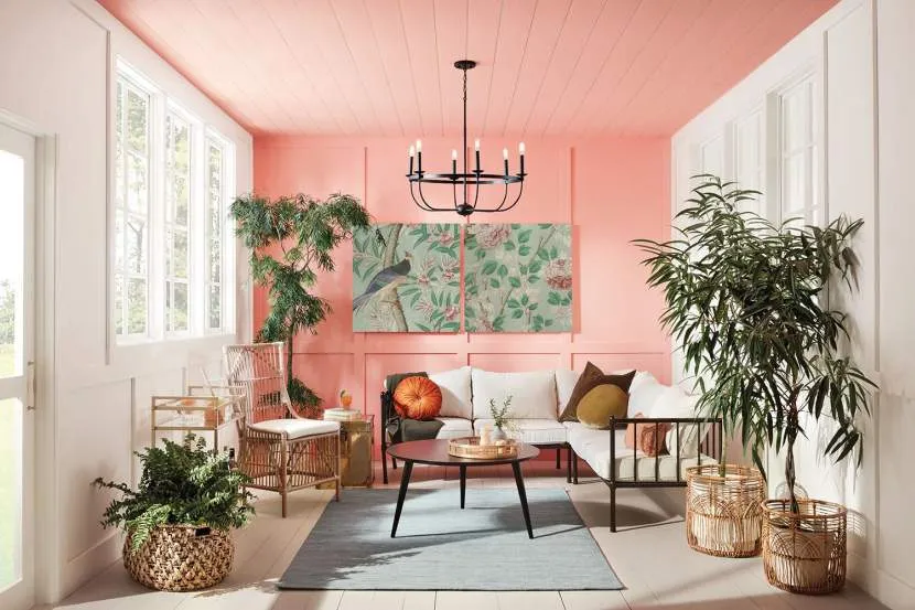 Бело-розовая гостиная с акцентной стеной и потолкомИсточник bhg.com