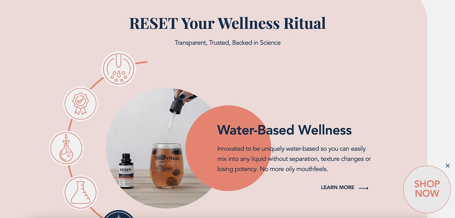 Тёмно-синий цвет шрифта на светлом розовом фоне даёт высокую контрастность, но текст при этом выглядит достаточно мягкоСкриншот: сайт Reset Bioscience / Skillbox Media