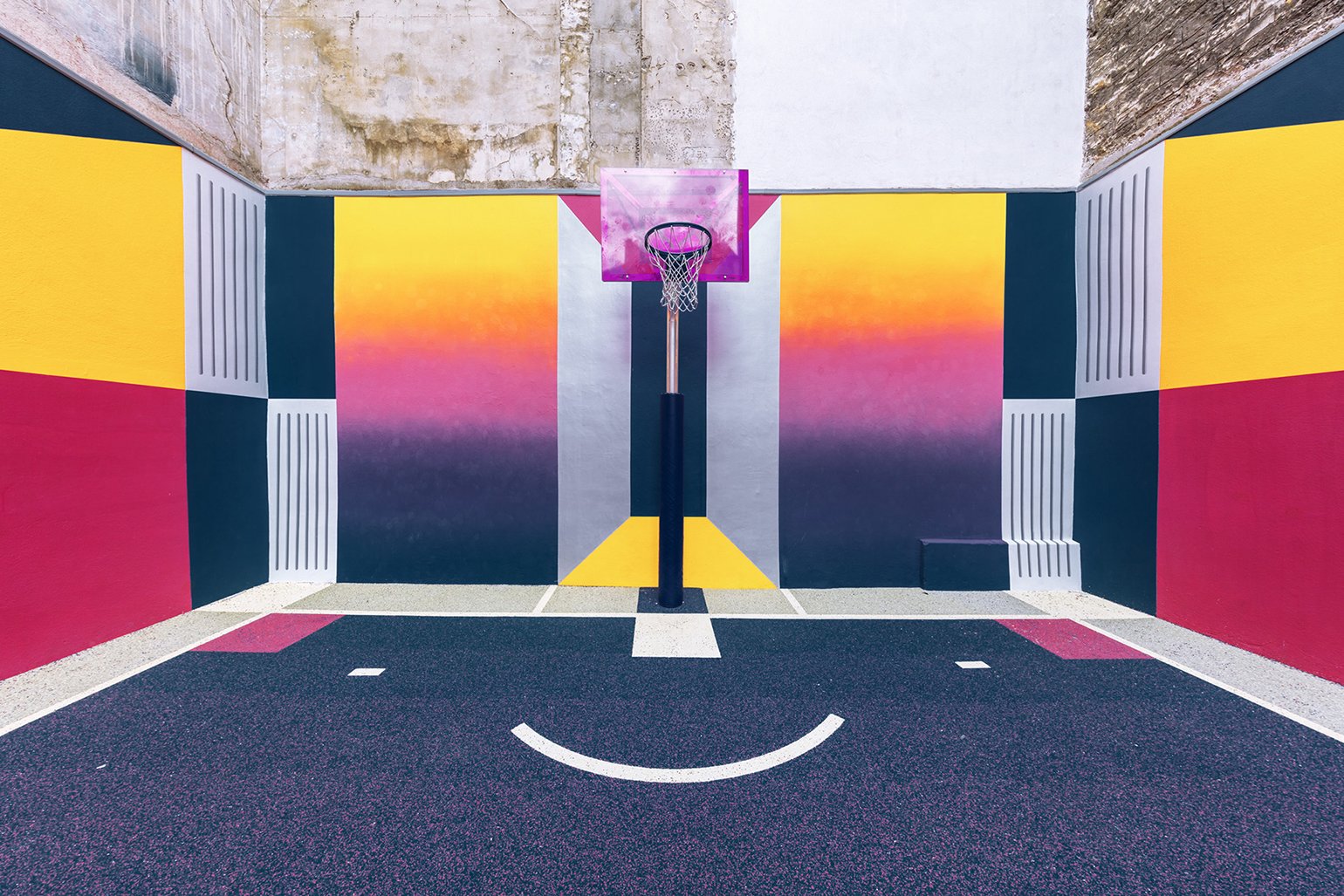 Нестандартное оформление уличной баскетбольной площадки: градиент и геометрические формы с глубоким тёмно-синим, несколькими оттенками розового и позитивным жёлтым цветомИзображение: Ludwig Favre / Behance
