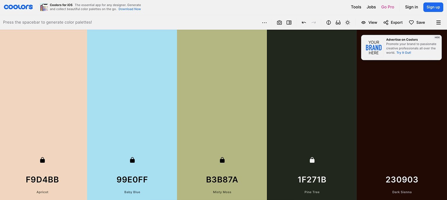 Сочетание абрикосового и бэби-голубого дополнено природными цветами — глубоким красно-коричневым, светлым и тёмным оттенками зелёного. Такая сложная цветовая схема вызывает ассоциации с поздним летом, натуральностью и альпийскими лесамиСкриншот: сайт Coolors / Skillbox Media