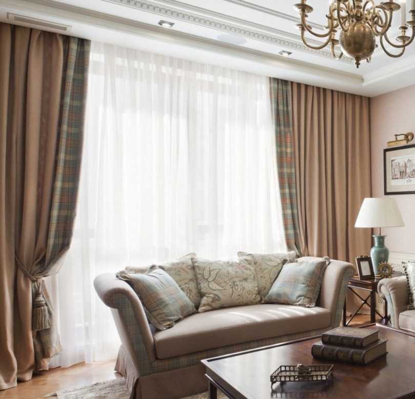 Шторы в гостиной можно использовать прямые, с бахромой, подхватами или ламбрекенами, их сочетают с нитяными занавесками, органзой или тюлем.