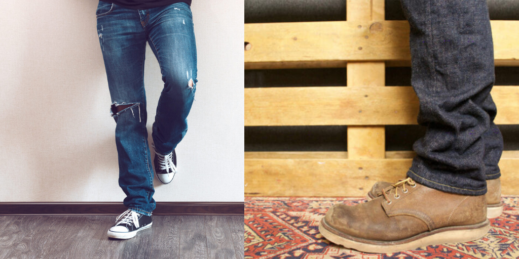 Классические мужские джинсы, сочетаются с любой обувью: классическими ботинками и туфлями, лоферами, мокасинами, кедами, кроссовками, брогами, берцами и др. Длина штанин при этом должна прикрывать края ботинок. Но для придания образу лоска можно подвернуть джинсы, показав края ботинок или оголив щиколотки.