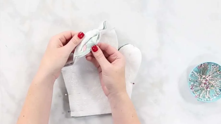 Полученную слоистую стопку скалывают булавками, чтобы было легче шить. Шитье варежки-прихватки выполняют по следующей схеме: