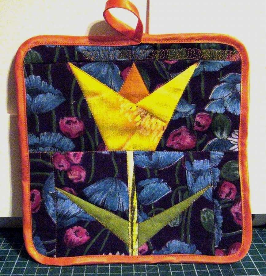 Прихватка называется «Тюльпан», выполнена в стиле пэчворк.