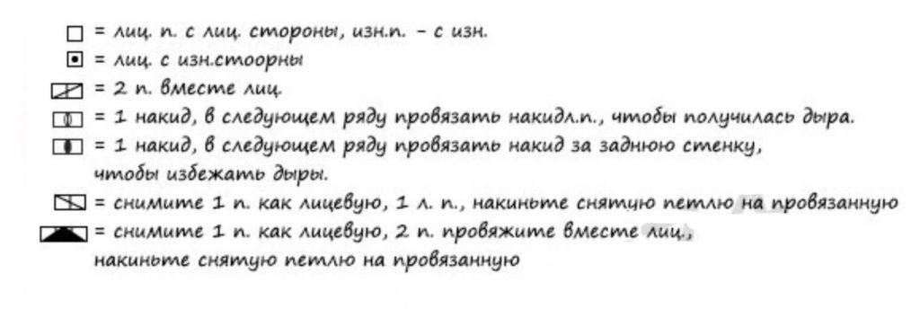 Выделенные убавления В в начале ряда: после кром. провязать 2 п. вместе лиц.; в конце ряда: перед кром, провязать 2 л. вместе протяжкой.