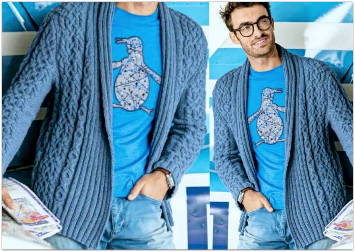 И последний красавчик на сегодня (я о кардигане… конечно же, о кардигане :D) — универсальная модель в стиле casual, светло-джинсового цвета. Широкая планка, которая одновременно служит и отложным воротником, а также отсутствие пуговиц, делают эту вещь ультрасовременной и подходящей практически под любой гардероб. Я уже не говорю о том, что такой кардиган и на женщинах будет смотреться не хуже.