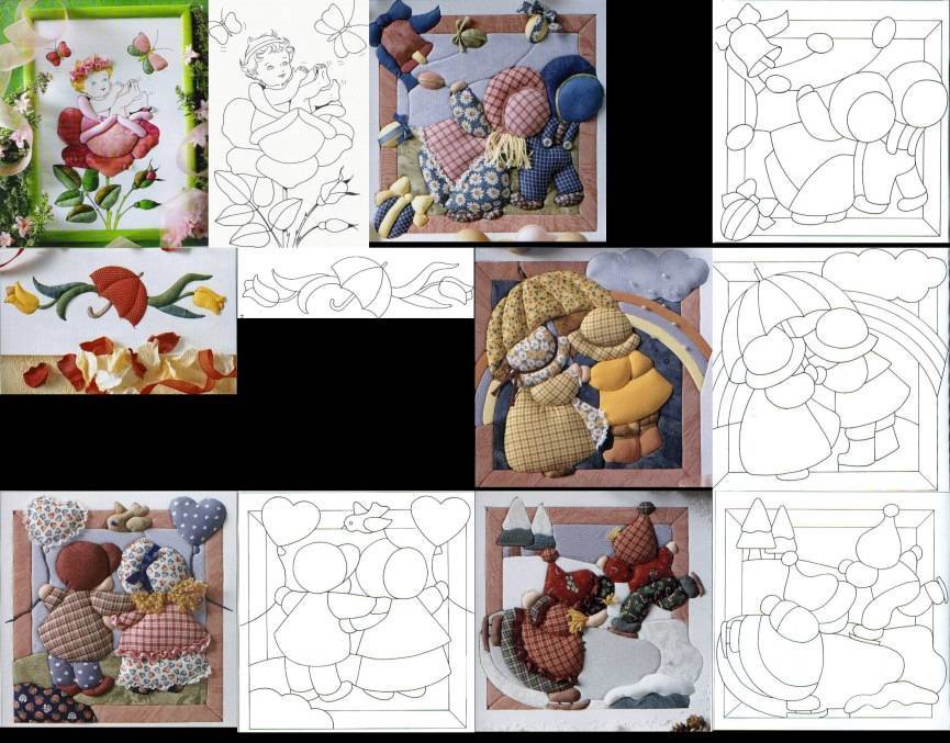 - Далее следует сам процесс создания аппликации: краешки всех сделанных подготовленных из ткани частей необходимо протолкнуть в канавки, чтобы они края погрузились в канавки и там плотно зафиксировались.