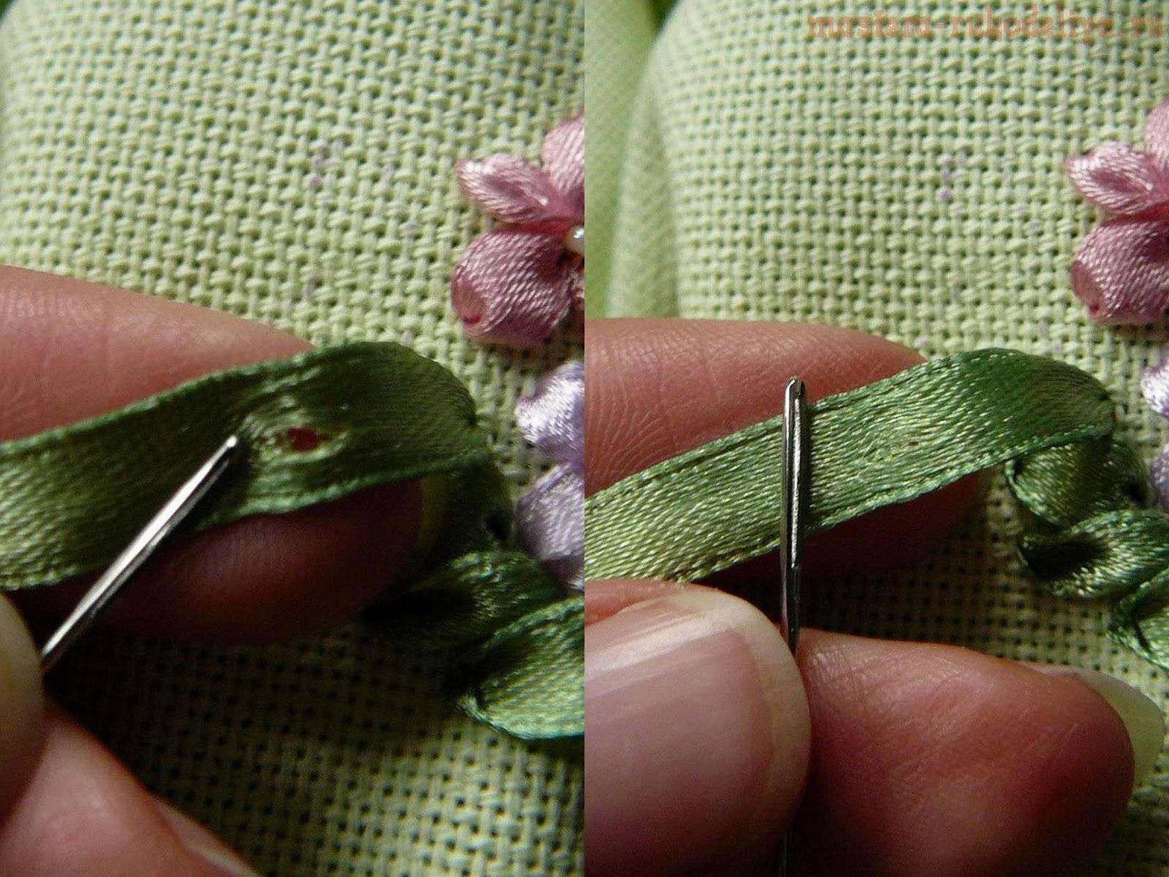 - Выполняя следующий стежок, иглу выводят через край ленты, который остался на изнаночной стороне.