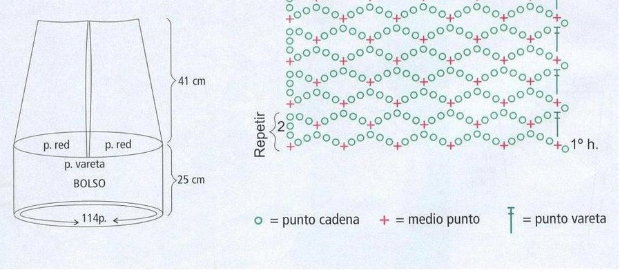 С правой стороны изображен узор ручек, состоящий из воздушных петель и столбиков без накидов. Если провязать основу сумки в высоту не 25 см, а больше, то нужно будет уменьшить длину ручек.