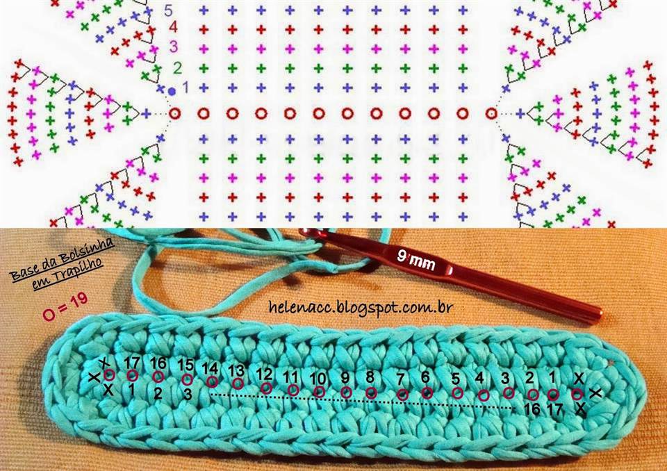 На фото схема донышка овальной формы для пляжной сумки, вязанной крючком. Вязать его следует с набора нужного количества воздушных петель цепочки.