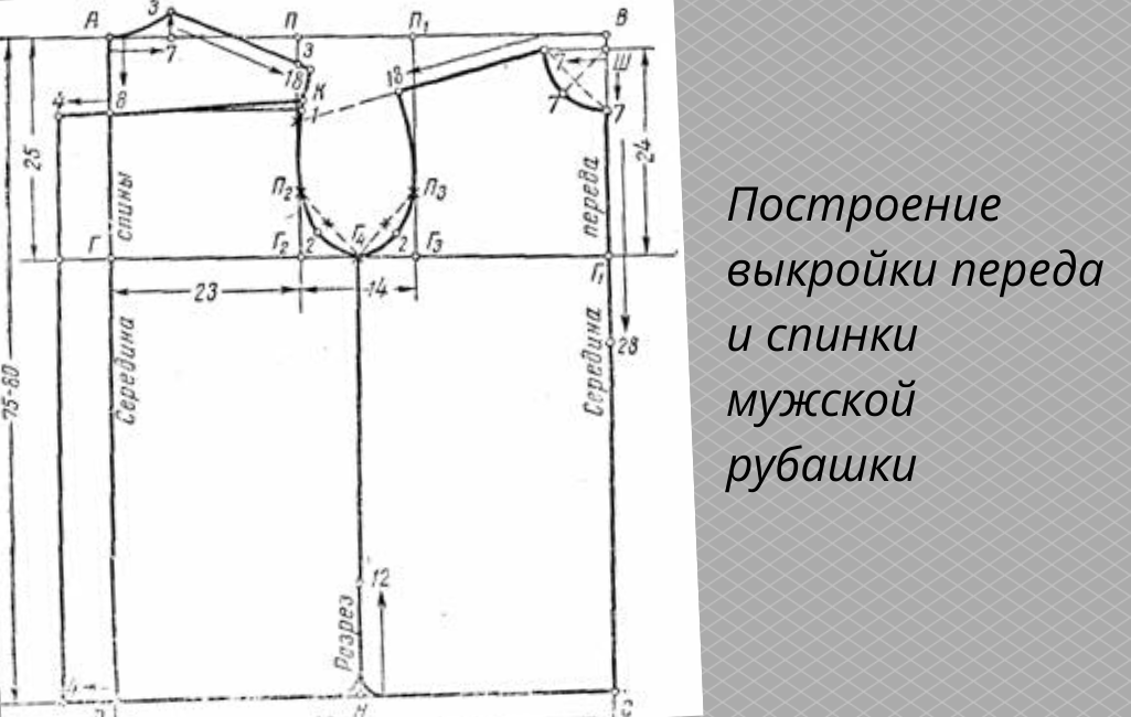 Для построения схематичной сетки чертежа, разработки выкройки мужской рубашки сначала собирают исходные данные. Делают вертикальные и горизонтальные замеры объемов для дальнейших расчетов: