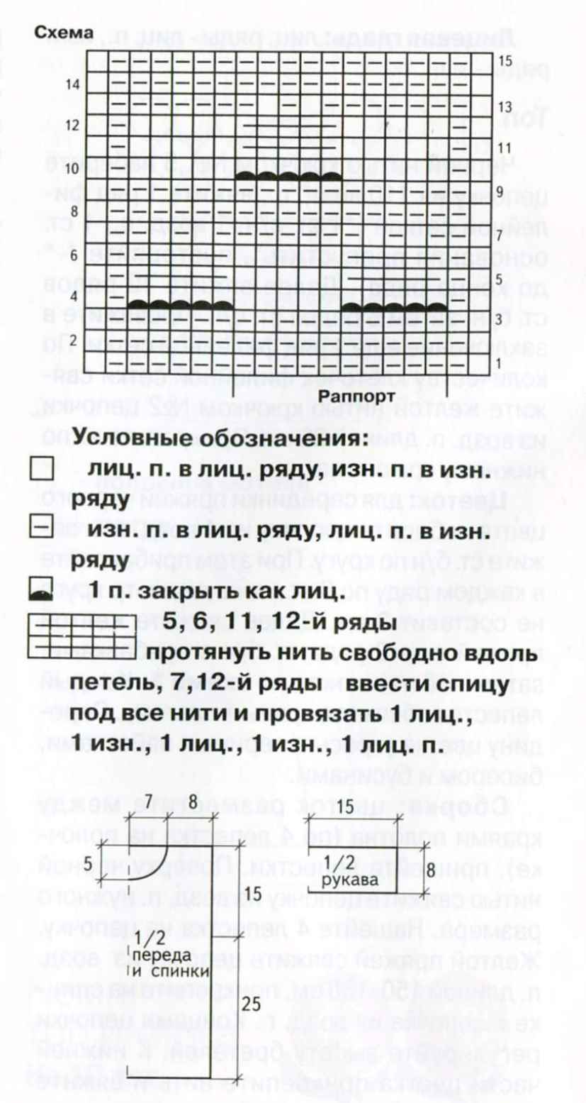 Плотность вязания: гладь лицев. спицы номера 4–22 петл.х32 ряд.=10×10 сантиметров; Узор Большой Жемчужный спицы номера 4–23 петл.х34 ряд.=10×10 сантиметра.
