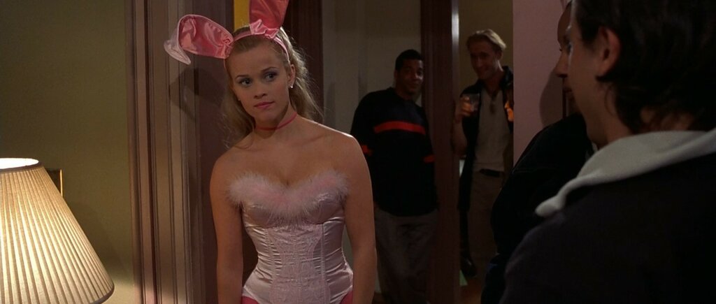 Эль Вудс (Риз Уизерспун) костюм зайчика из розового атласа с вышивкой и меховой окантовкой декольте, на голове розовые ушки, на ногах бордовые колготки и блестящие розовые туфли Miu Miu. Это девчачья версия костюма, смешная и не такая откровенная, как у заек Playboy.