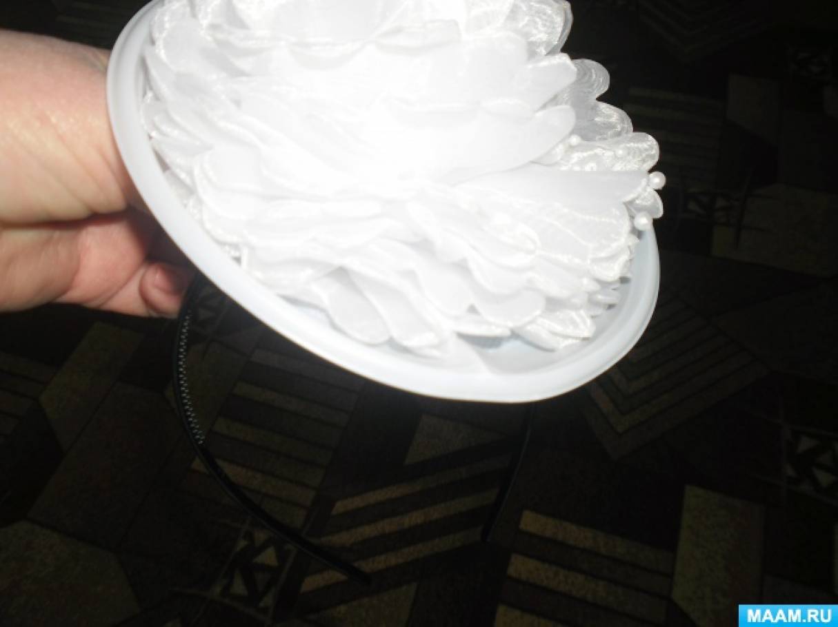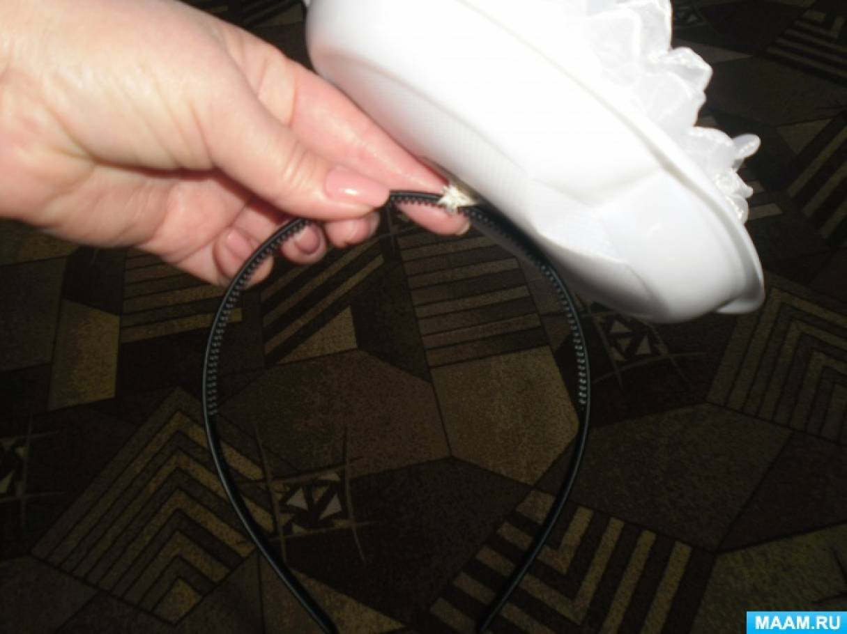 Украшение на голове – ободок, к которому пришита тарелка с бантом.