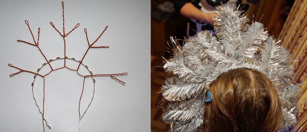 Голову также можно украсить мишурой. Измерьте окружность своей головы, прибавьте 2 см, отмерьте по этой длине проволоку и отрежьте нужный кусок, согните ее, чтобы получить окружность. Обвейте проволоку мишурой, превращая ее в роскошный пушистый ободок, края скрепите ниткой. У вас получится красивый костюм — вы и ребенку понравитесь, и на взрослых произведете впечатление.