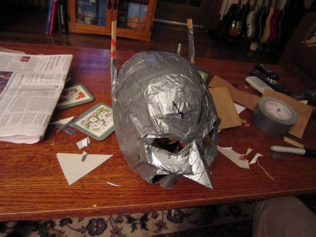 Потом начинают оборачивать по окружности головы и верхней лицевой части клейкими полосками. Нос нужно слегка удлинить и придать ему угловатую форму. Для этого вырезают треугольник из картона и складывают его пополам, чтобы создать центральный сгиб. Затем оклеивают сверху и снизу скотчем. Ленты скотча укладываются друг на друга в несколько слоев, отчего получается довольно плотный шлем. Аккуратно снимите заготовку с головы ребенка и вырежьте ножницами отверстия для глаз и подровняйте края. Уши для шлема формируют накладками из свернутого трубочками картона. С двух сторон их оклеивают скотчем, полностью скрывая бумагу.
