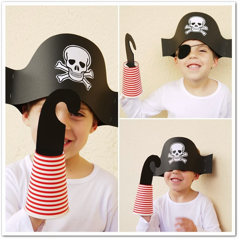 Пиратская шляпа. Костюм пирата для мальчика нельзя считать полноценным без пиратской шляпы. Чтобы сделать такую пиратскую шляпу своими руками, вам потребуется распечатать шаблон треугольника из бумаги, вырезать его и наклеить на картон для плотности. Картонная повязка на голову позволит шляпе идеально сидеть на голове. Не забудьте украсить шляпу изображением черепа и костей – все пиратский символ.