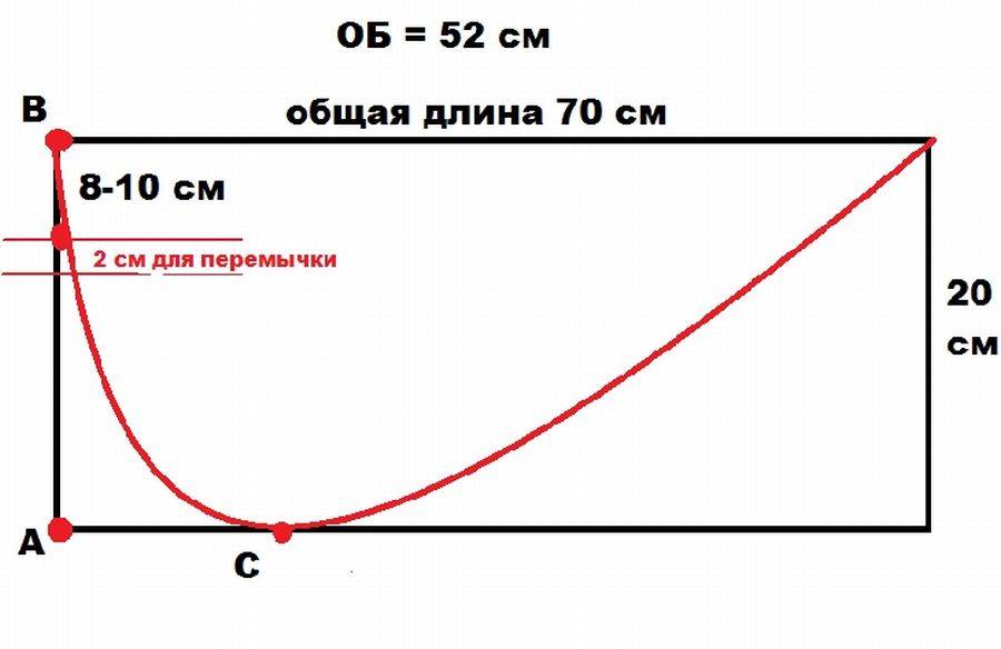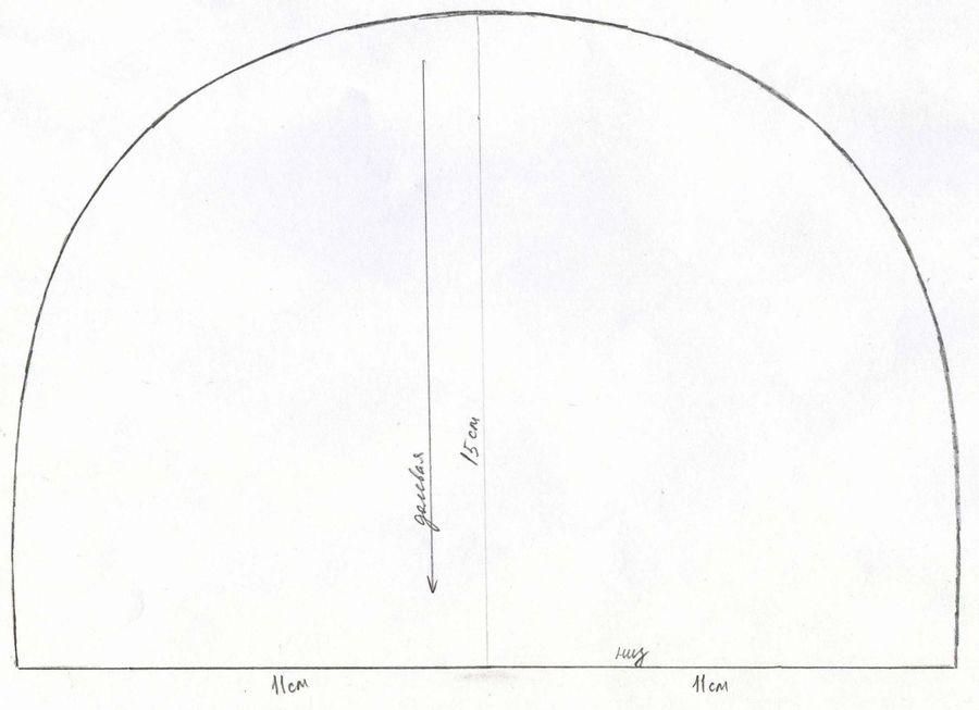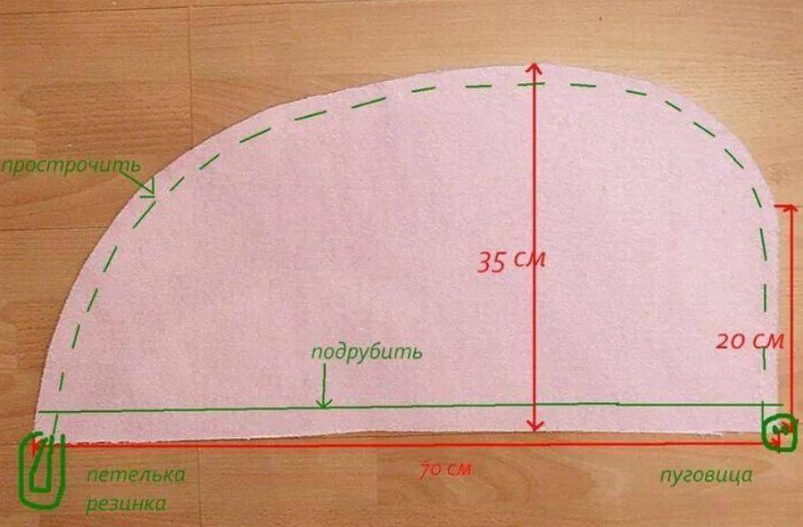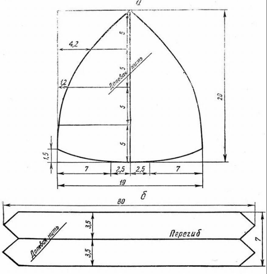 Ещё одна схема-выкройка. В качестве объёма головы тут выбран показатель в 50 см, но, конечно, у всех он индивидуален. Ширину тоже можно брать любую, не обязательно 20 см. Чем шире изделие – тем больше складок можно на нём сделать!
