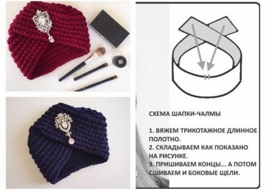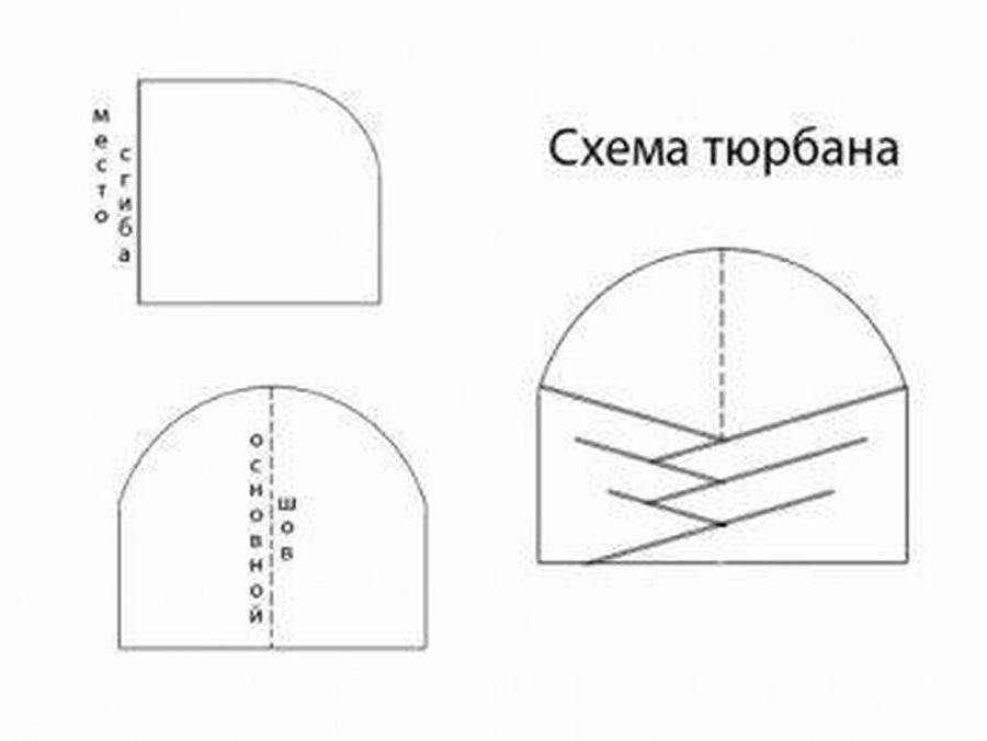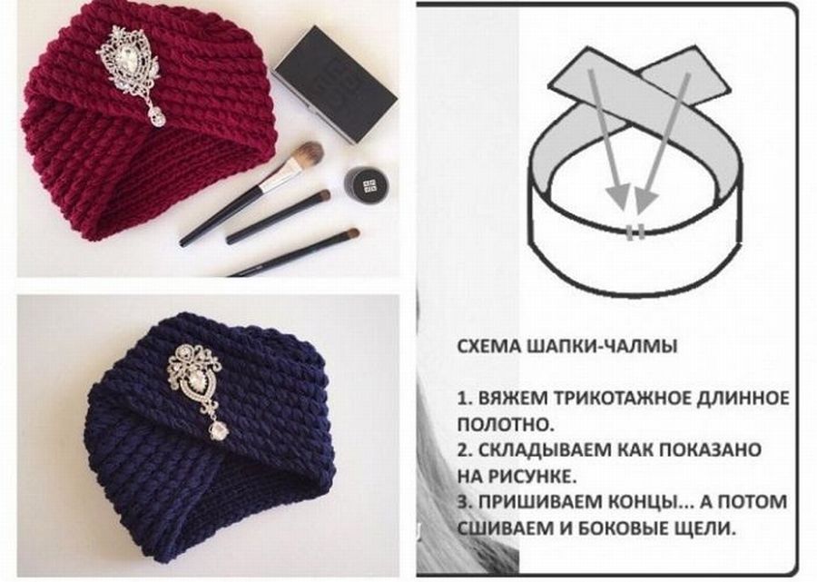 А вот схема создания чалмы из вязаного полотна. Кстати, эта модель вполне подходит и для мужчин! Если хочется сделать её более строгой, брошь можно не прикреплять. А можно и прикрепить, и тогда получится праздничный головной убор.