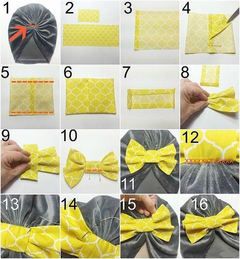 А вот понятная схема создания украшения к чалме – оно поможет нивелировать линию соединения. Такой бантик окажется и полезен, и придаст изюминку образу.