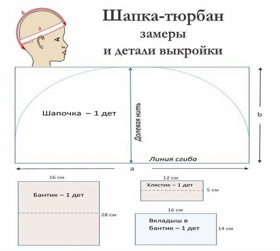 А вот вариант шапочки-тюрбана, которая подойдёт и взрослым, и детям. Замеры приводим детские, а взрослым придётся, конечно, несколько увеличить показатели. Но схема в целом актуальна для всех.
