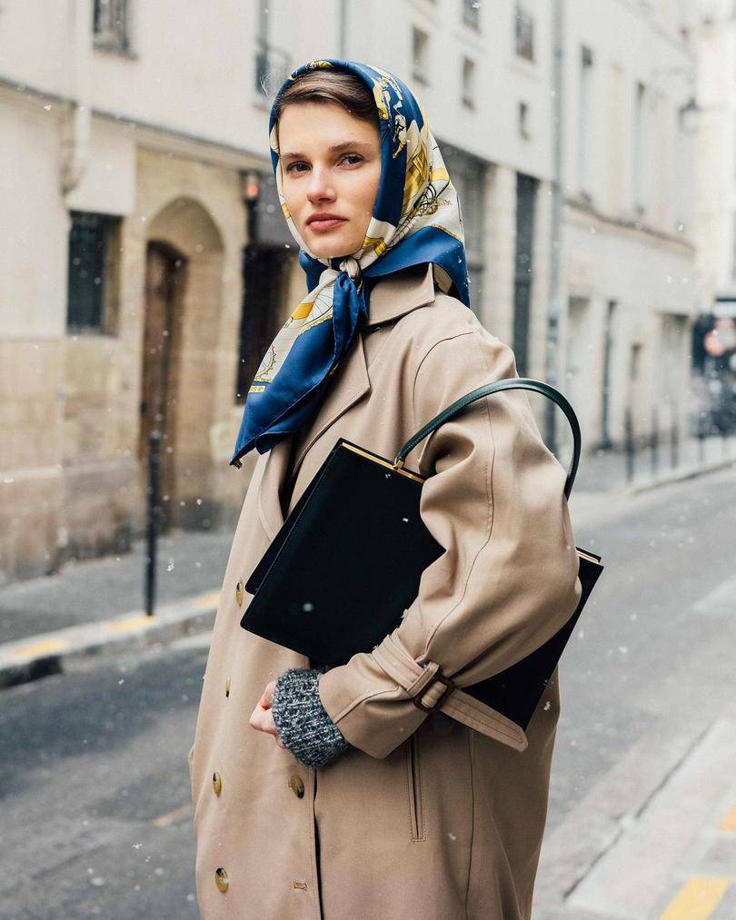 В зимнюю стужу в ход идут теплые шерстяные. Они согреют, защитят волосы от снега и ветра и не испортят укладку, чего не скажешь о шапке. Небрежно завяжите его как это делали наши бабушки или возьмите за основу моду 70-х и повторите технику Мирославы Думы.