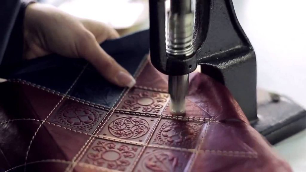 Если шлифовка не помогла устранить все дефекты, на помощь приходит тиснение. Для этой «процедуры» используют плиты, которыми прессуют разогретую шкуру. Прессованная кожа может быть как гладкой, так и с самыми разнообразными рисунками.